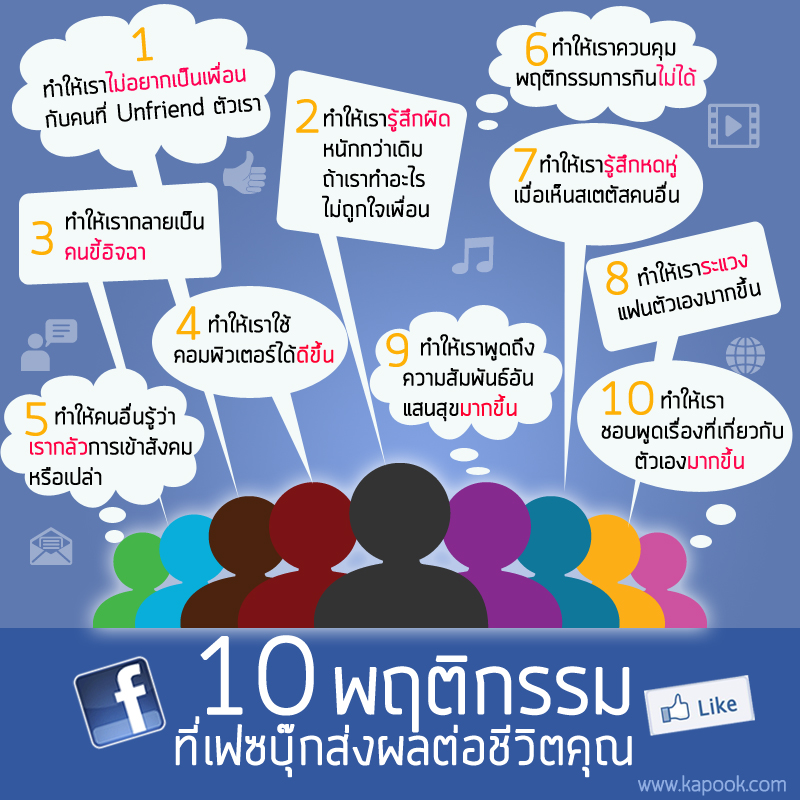 10 พฤติกรรมเฟซบุ๊กที่ส่งผลต่อชีวิตคุณ อัปเดตล่าสุด 22 ตุลาคม 2556 เวลา 23:08:47 12,694 อ่าน